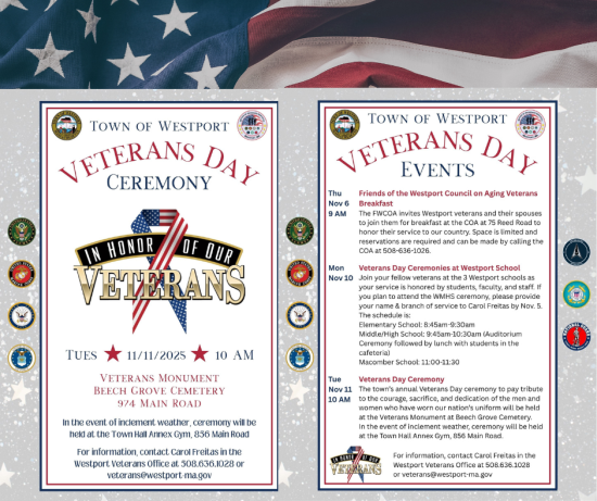 ~Veterans Breakfast in Westport, MA - Friends of the Westport Council on Aging Thursday, November 6 at 9:00 AM Westport COA, 75 Reed Road